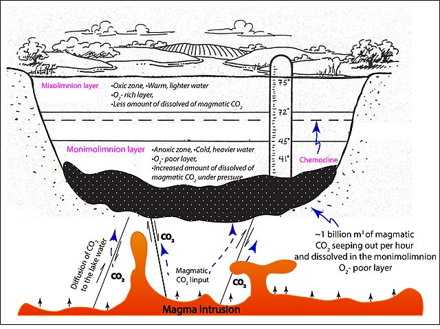 사진출처: 니오스 호수, 모누운 호수, CO₂ 축척 구조 모식도(Wikimedia Commons / 퍼블릭 도메인 / CC 라이선스)